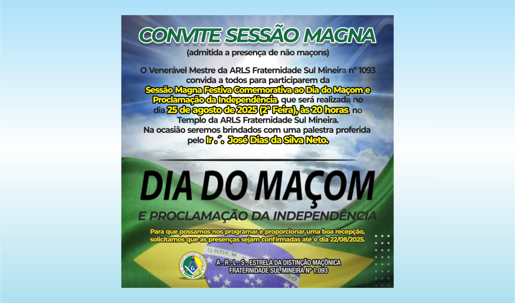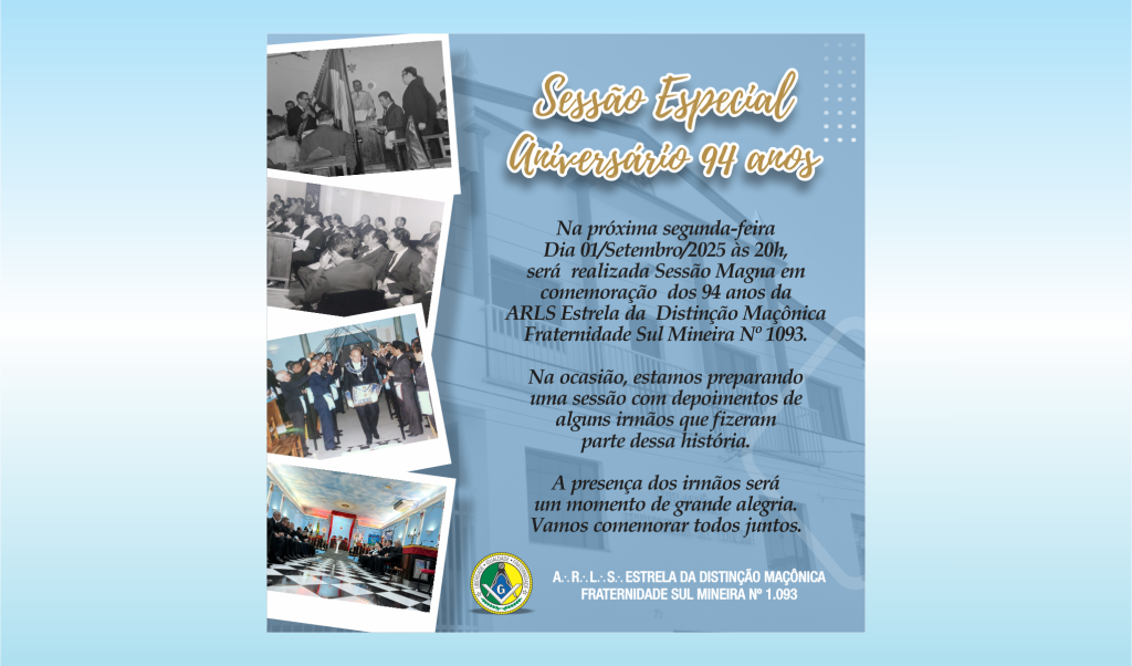 Na próxima segunda-feira, dia 01/Setembro/2025 às 20h, será realizada Sessão Magna emcomemoração dos 94 anos da ARLS Estrela da Distinção Maçônica Fraternidade Sul Mineira Nº 1093. Na ocasião, estamos preparando uma sessão com depoimentos de alguns irmãos que fizeram parte dessa história. A presença dos irmãos será um momento de grande alegria. Vamos comemorar todos juntos.