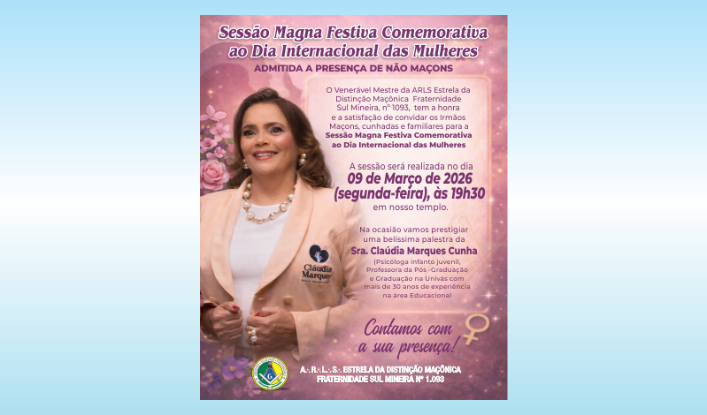 O Venerável Mestre da ARLS Estrela da Distinção Maçônica Fraternidade Sul Mineira, nº 1093, tem a honra e a satisfação de convidar os Irmãos Maçons, cunhadas e familiares para a Sessão Magna Festiva Comemorativa ao Dia Internacional das Mulheres. A sessão será realizada no dia 09 de Março de 2026 (segunda-feira), às 19h30 em nosso templo. Na ocasião vamos prestigiar uma belíssima palestra da Sra. Claúdia Marques Cunha Silva (Psicóloga infanto juvenil, Professora da Pós -Graduação e Graduação na Univás com mais de 30 anos de experiência na área Educacional. Contamos com a sua presença!ADMITIDA A PRESENÇA DE NÃO MAÇONS